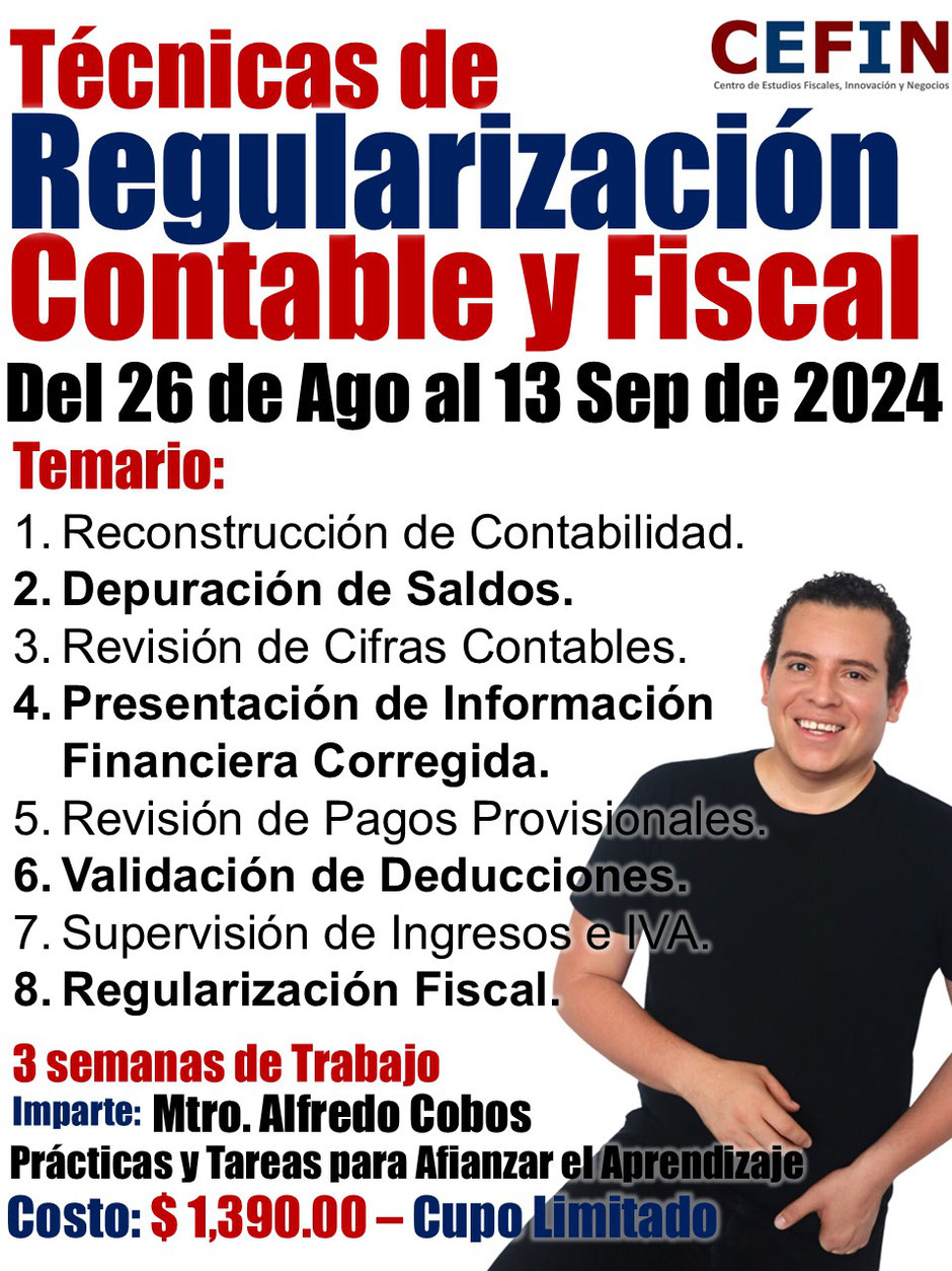 Nuestro Curso 100% en Linea Técnicas de Regularización Contable y Fiscal, tiene un costo de $ 1,390.00 pesos por participante (incluye IVA, facturamos tu pago). Arrancamos el Lunes, 26 de Agosto de 2024.