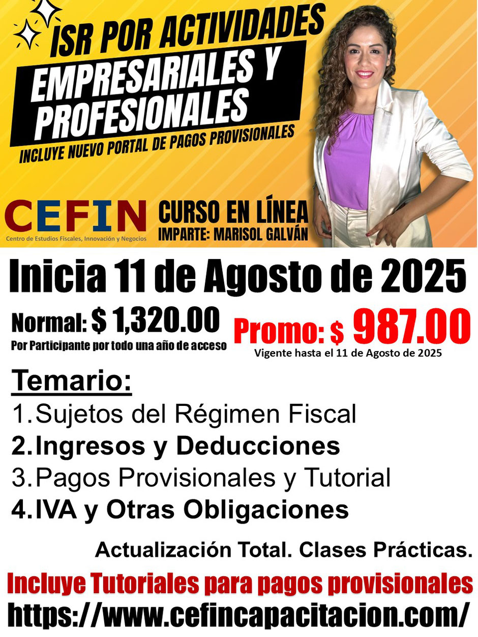 📝 Los cambios fiscales están aquí. ¿Sabes cómo calcular correctamente el ISR por Actividades Empresariales y Profesionales? Evita errores y domina el Portal de Pagos Provisionales con el curso más completo, impartido por la experta C.P. Marisol Galván. ✅ ¡RESERVA TU LUGAR AHORA!